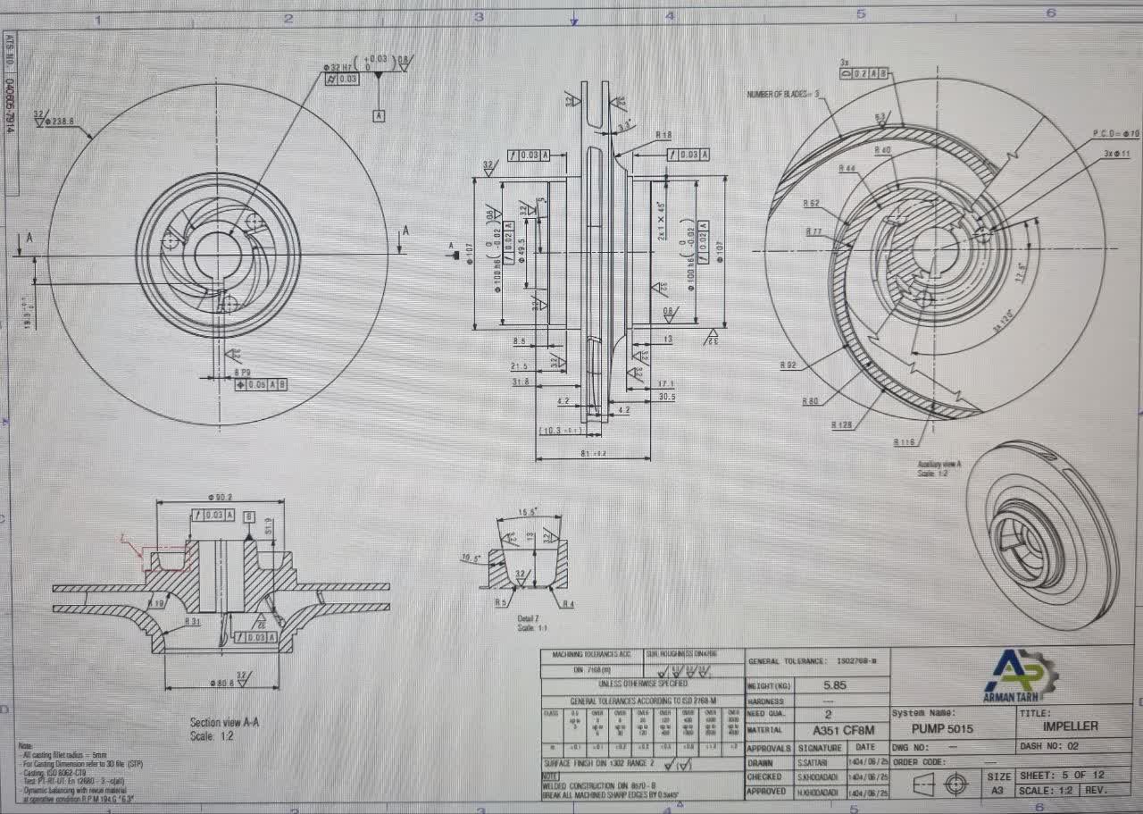 در مدل ۴۰-۲۵۰، ما با یک پمپ "هد بالا" (High Head) مواجه هستیم. به دلیل قطر ۲۵۰ میلیمتری پروانه، سرعت خطی در نوک پروانه (Tip Speed) بسیار بالاست. این سرعت بالا باعث میشود که اگر در متریال انتخابی یا فشار ورودی (NPSH) اندکی خطا وجود داشته باشد، پدیده سایش و خوردگی در لبههای پروانه با قدرتی تخریبی و سرعتی باورنکردنی رخ دهد؛ درست همانند اتفاقی که برای پمپ واحد ما افتاد.